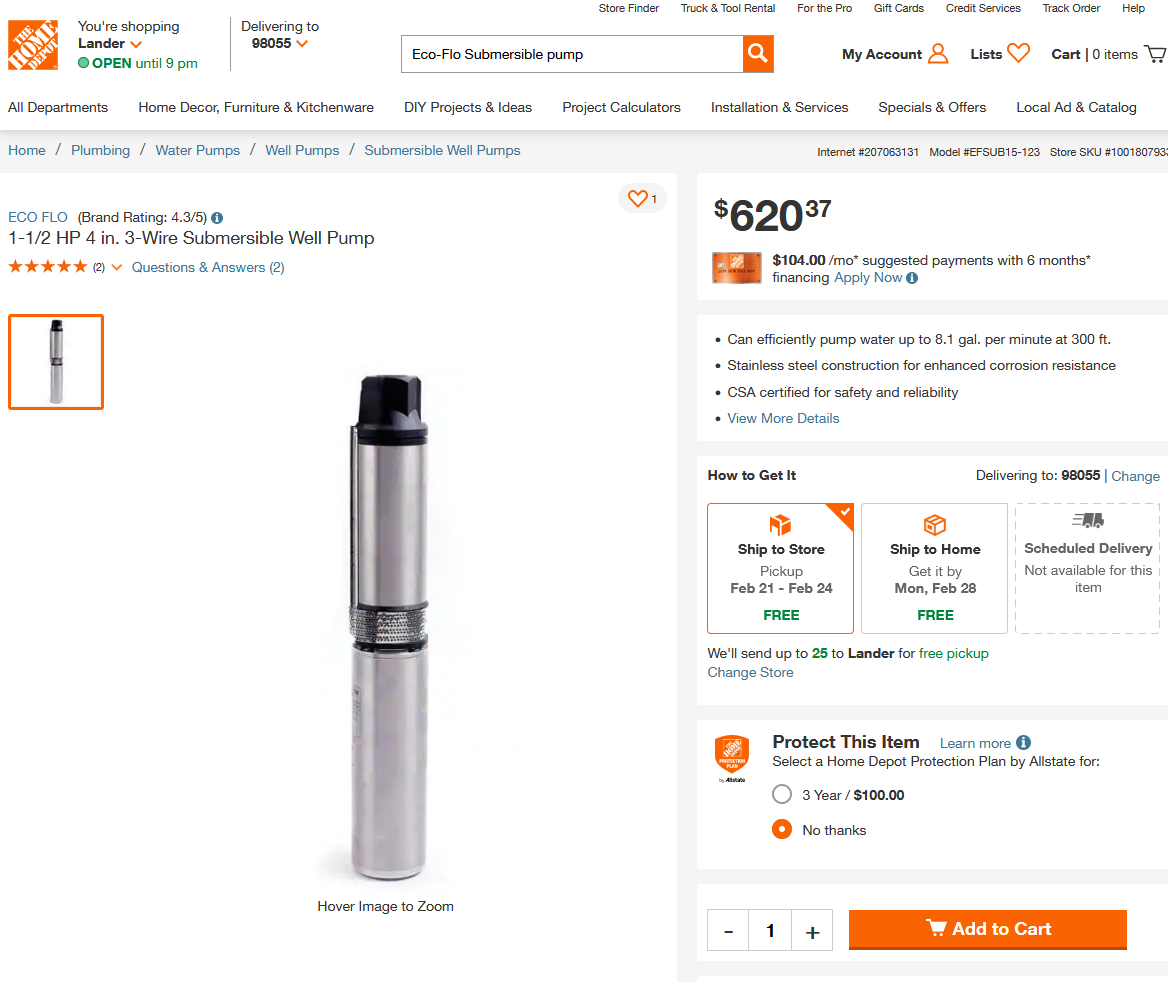 Purchased a new pump from Home Depot, 1.5 HP. This one is rated at 10 GPM, versus the approximately 20 GPM from the previous one. The original pump that was in place when Rick bought the house was also 10 GPM. This might have made it more durable.